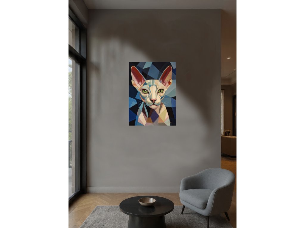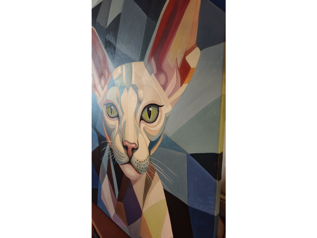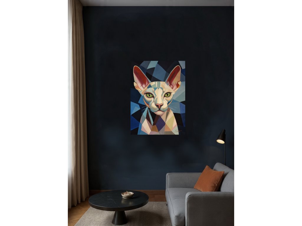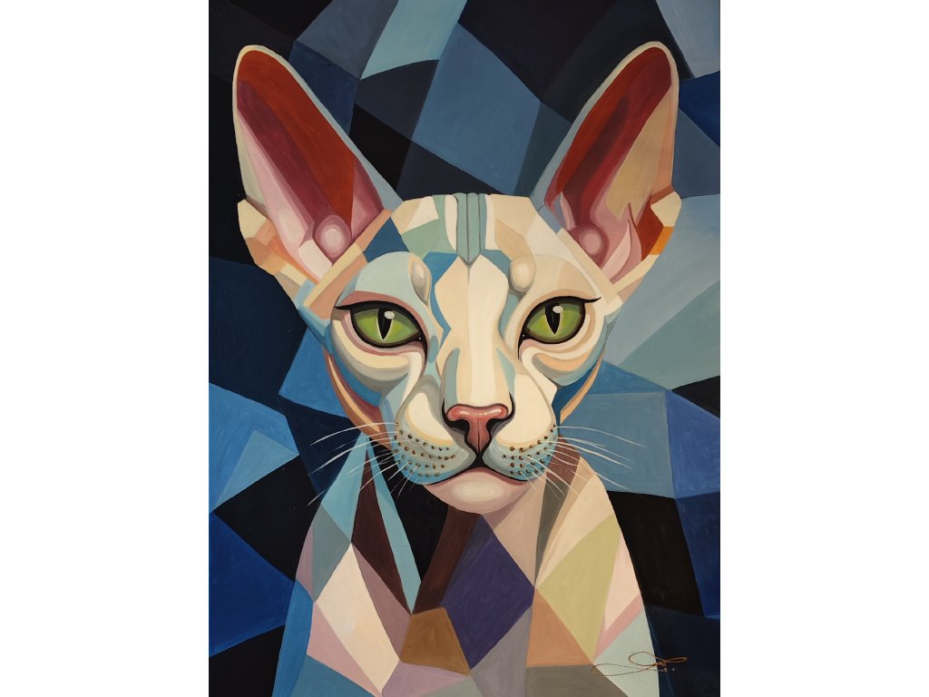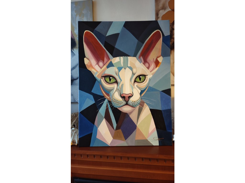 Tento originální obraz o rozměrech 75x55 cm zachycuje portrét sfinx kočky v podmanivém geometrickém stylu.