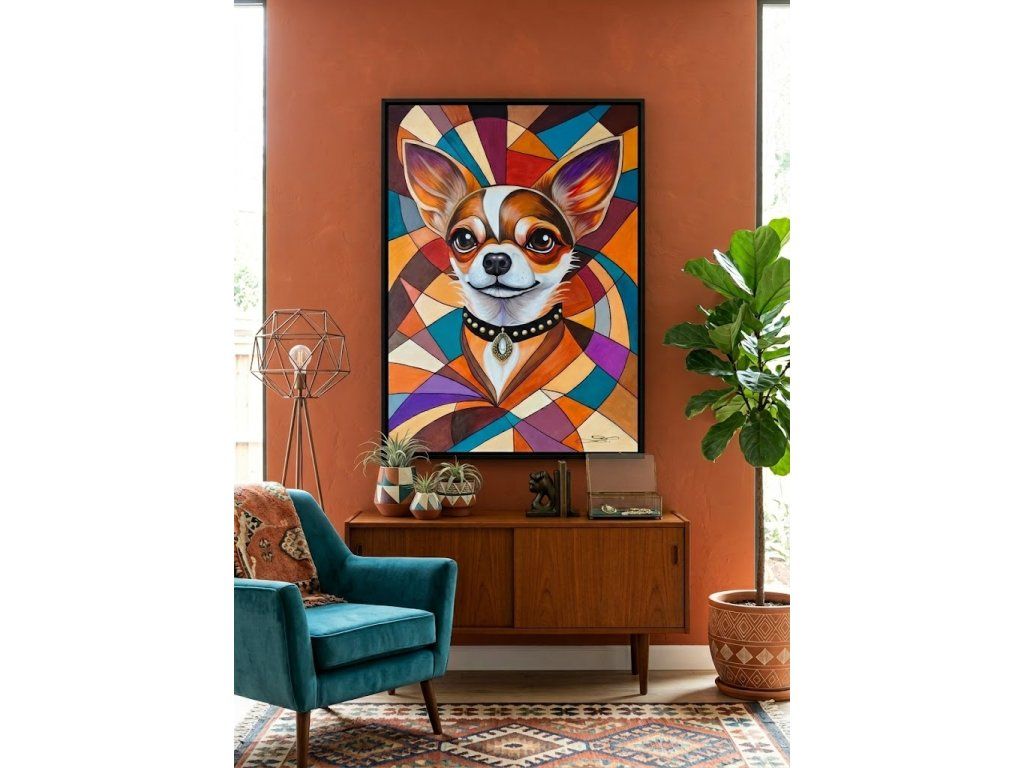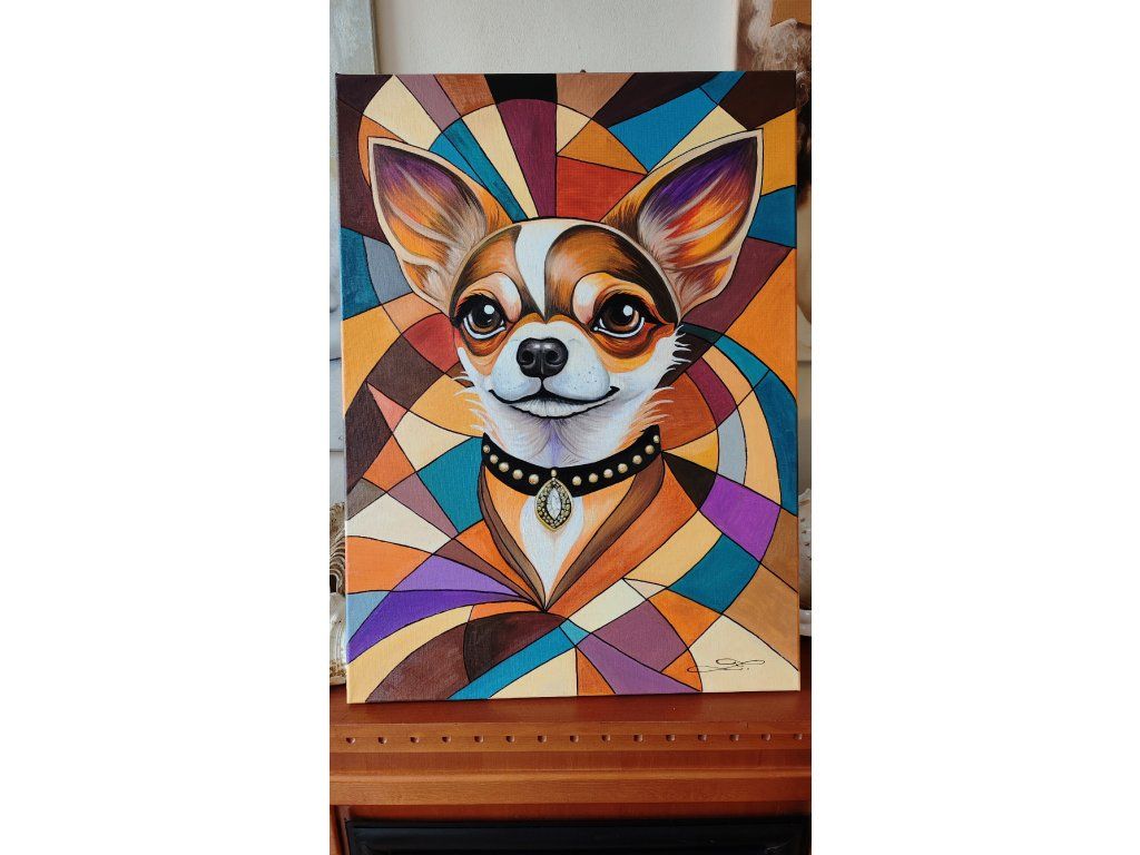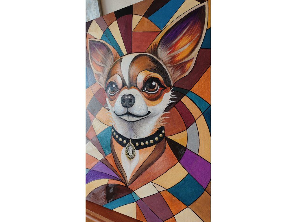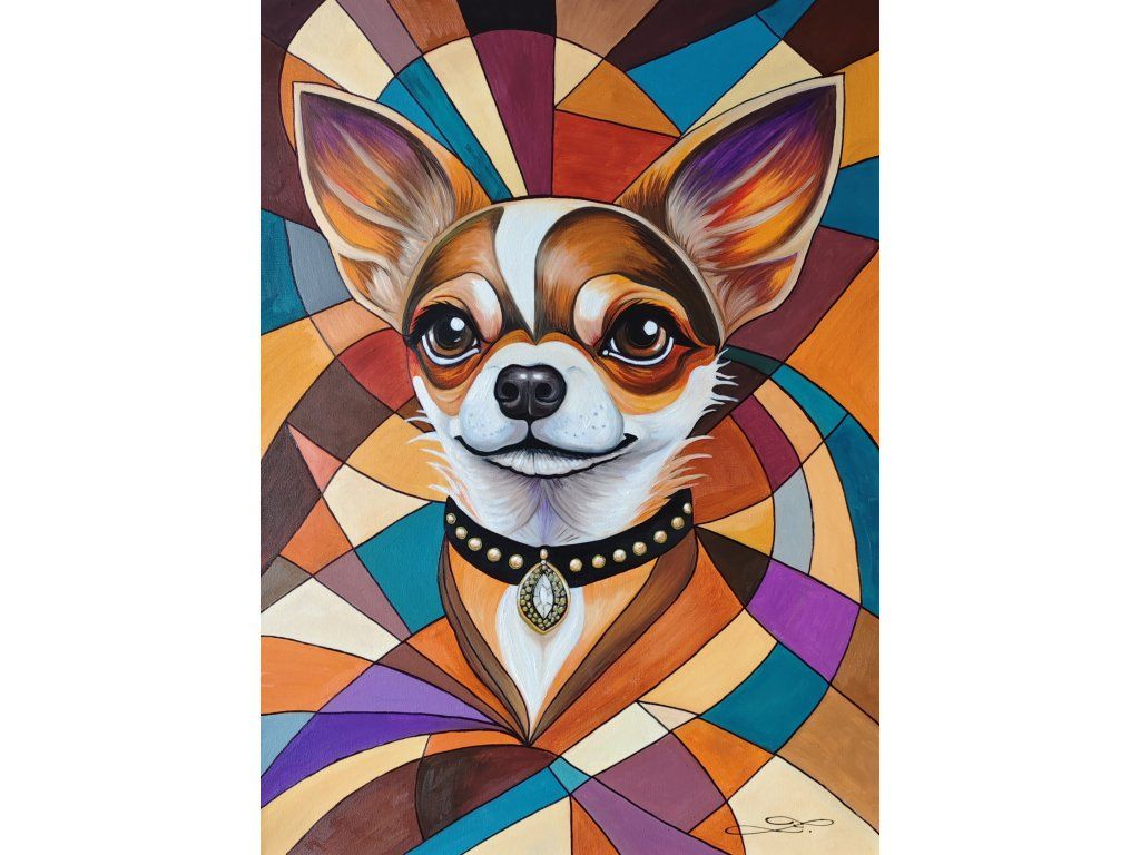 Pohled psa je hluboký a inteligentní, což zjemňuje jinak přísnou geometrii pozadí. Elegantní černý obojek se zlatým kováním a výrazným šperkem ve tvaru kapky dodává portrétu nádech luxusu a aristokracie. Celkové vyznění je veselé, sebevědomé a stylové.