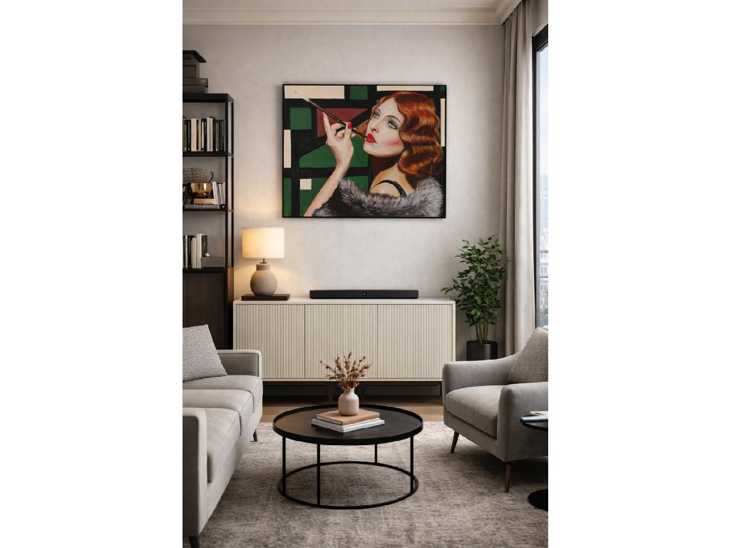 Tento obraz zachycuje okamžik tiché elegance a vnitřního soustředění. Portrét ženy s jemně nakloněnou hlavou a výraznými rudými rty působí jako zastavený filmový záběr – chvíle mezi nádechem a myšlenkou.