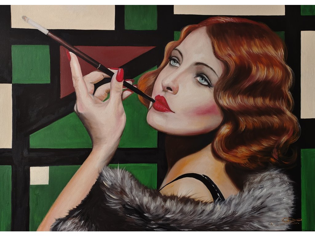 Detailně propracovaná tvář, měkké vlny vlasů a dotek kožešiny na ramenou vyzařují smyslnost i sebedůvěru. Jemné gesto ruky s dlouhou cigaretovou špičkou není symbolem kouření, ale znakem zastavení, klidu a osobního rituálu.