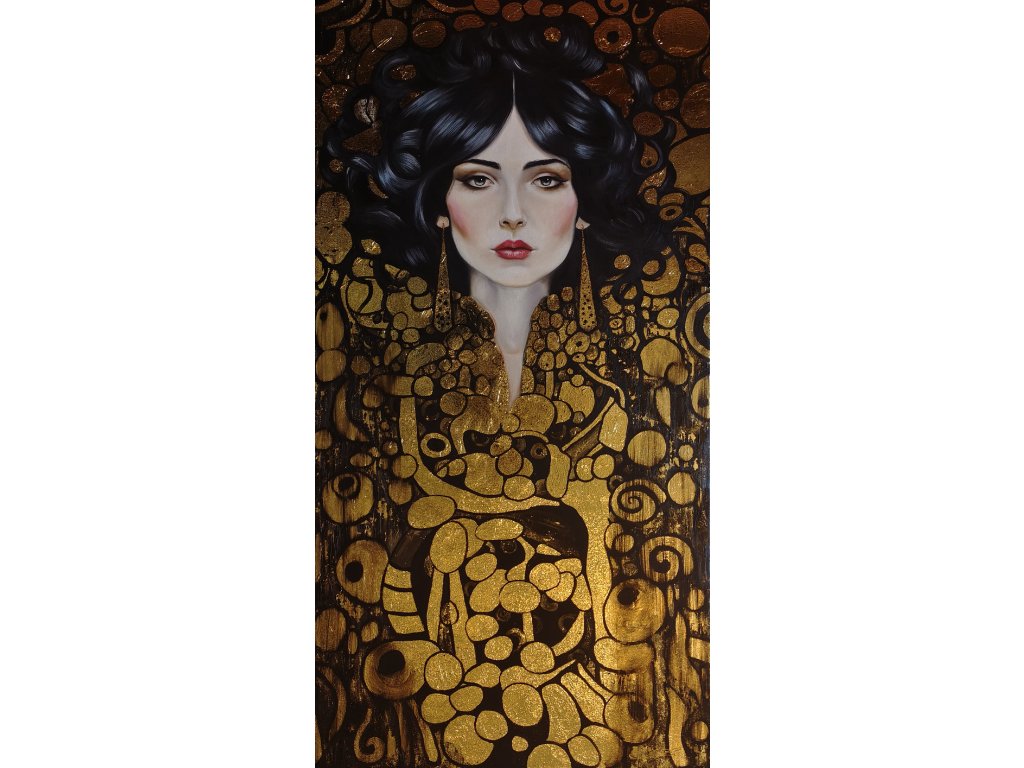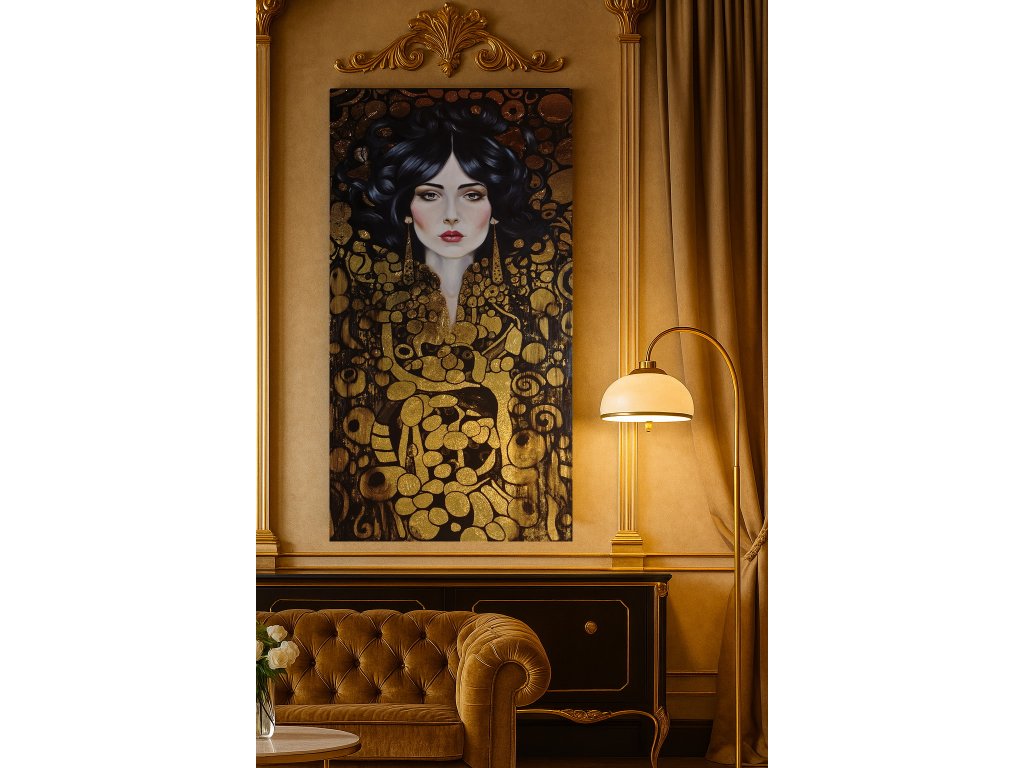 Tento obraz představuje okouzlující ženu s tmavými, vlnitými vlasy, jejíž tvář vystupuje z mozaiky zlatých tvarů a ornamentů. Styl připomíná zlatou éru Art Nouveau – kombinuje moderní eleganci s bohatými dekorativními prvky. Kontrast černého pozadí a zářivých zlatých detailů vytváří dojem luxusu a tajemna. Obraz působí jako symbol síly, ženské sebejistoty a sofistikované krásy.