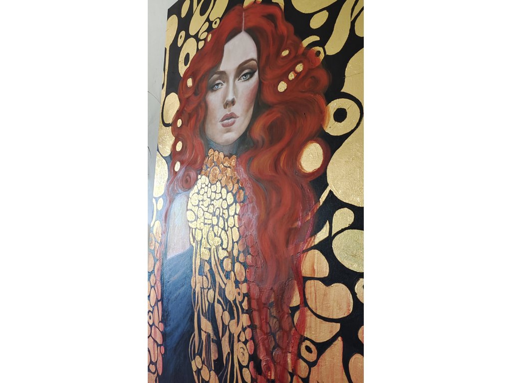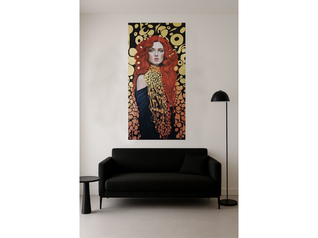 Obraz Zlatá múza vyzařuje osobní energii a hloubku – je poctou ženské kráse, svobodě a inspiraci. Ohnivě rudé vlasy ženy vystupují z temného pozadí a splývají se zlatými ornamenty, které evokují luxus a exkluzivitu. Dílo přitahuje pozornost svou intenzitou a je výrazným statement-piecem do každého moderního interiéru – od luxusního apartmánu po designový showroom.